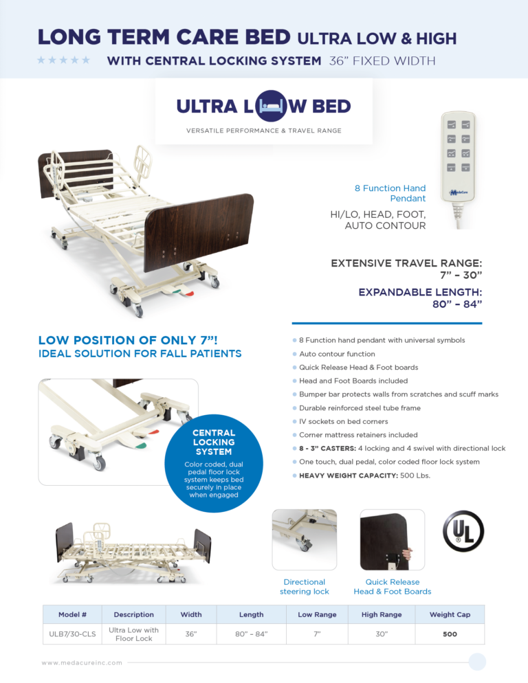 The ULB7/30-CLS with Central Locking System is the most adaptable frame for long term care. With an ultra low range of only 7″ and a high range of 30″, plus an extendable length from 80″- 84″, it has everything you need in a bed frame. Plus the One Touch color coded Floor Lock System is easy for caregivers to engage and disengage. Whisper quiet Linak actuators and an auto contour function make it the ideal bed for senior care.